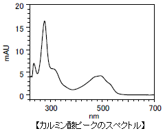 コチニール色素の試験法としては、衛生試験法にTLCが記載されていますが、参考法としてHPLCを用いた測定例も紹介されています*2。今回はこの測定条件に準じて、HPLC-DADを用い食品中のカルミン酸を測定しました。カルミン酸の定性にはピークの保持時間に加え、DADの吸収スペクトルによる確認も合わせて行いました。