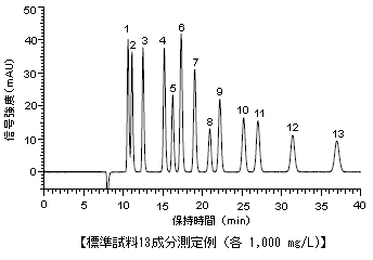 13成分の検量線は、50 ~10,000 mg/L の範囲で寄与率0.9997 ~0.9998と、良好な直線性を示しました。