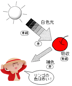 ある物質にいろいろな色を含む光(白色光)を当てたとすると、物質はその中から好きな色だけを取り込んで離さなくなり(この現象を「吸収」という)、嫌いな色が私たちの目にその物質の色として見えるのです。(「補色」という)