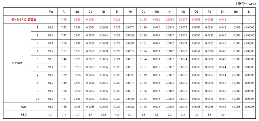 - Mg-Al-Zn合金の認証標準物質を10箇所測定し、平均値 (Avg.)と相対標準偏差 (RSD) 算出しました(表3)。
