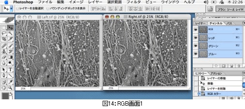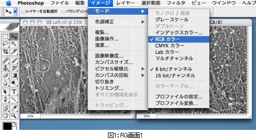 RG法と同じように±10度傾斜させて撮影した電子顕微鏡写真2枚を用意し、デジタル化し、tifファイルで保存する。この2枚の画像便宜上「Right」「Left」とする。両方の画像をグレースケールからRGBに変換する。すなわち、「イメージ」をプルダウンし「モード」から「RGBカラー」を選ぶ(下図14)。