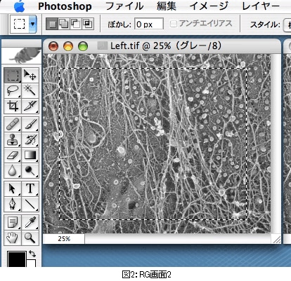 同一視野を±10度傾斜させて撮影した電子顕微鏡写真2枚を用意し、デジタル化してtifファイルで保存する。また、オリジナル画像をうっかり上書きしてなくさないようにrenameしておくことを勧める。ここでは簡単にRight、Leftと名付けた。