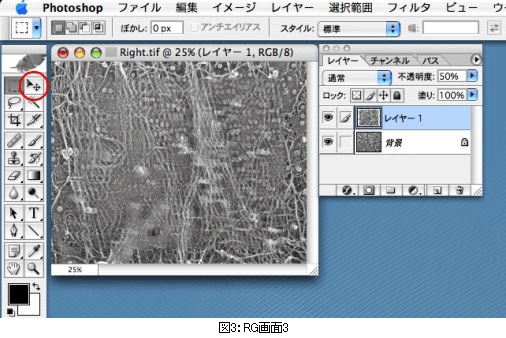 下図3ようにペーストした画像と背景画像は少なからずずれている。移動ツール(上図3の赤丸部)を選択し、移動キー(十字キー)を使用して位置を合わせる。観察したい部分を完全に合致させる。キーではX-Y方向は合わせることが出来るが、回転角は合わせることが出来ない。回転角がずれていると渦巻き状にぼけるので直ぐに分かるが、補正するにはどちらかのオリジナルの画像を数度回転させる。これは写真フィルムをデジタル化する時にどちらかのフィルムが回転方向に動いてしまったことによる。フィルムの置き方に注意すれば防ぐことができる。位置を合わせたら不透明度をもとの100%にもどす。