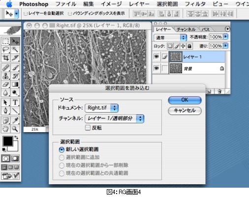 「選択範囲」をプルダウンし「選択範囲を読み込む・・・」を選ぶ(下図4)。レイヤー1が選択されていることを確認し、OKをクリックする。要するに重ねたレイヤー1の範囲を選択することである(下図5)。