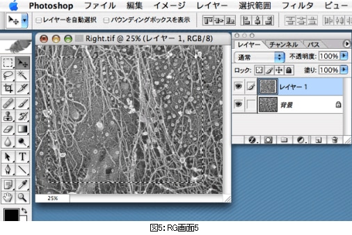 コピーした画像をRGBに変換した「Right」画像上にペーストする。レイヤーとしてはRGBに変換した画像が背景となり、ペーストした画像がレイヤー1となる。