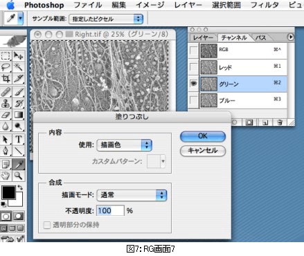 表示をレイヤーからチャンネルに切り替え、グリーンのところをクリックし、グリーンのチャンネルのみを選択する(目玉マークはグリーンの横のみ点灯)。「編集」をプルダウンし「塗りつぶし・・・」を選択(下図7)。OKを押すと下図8のようになる。