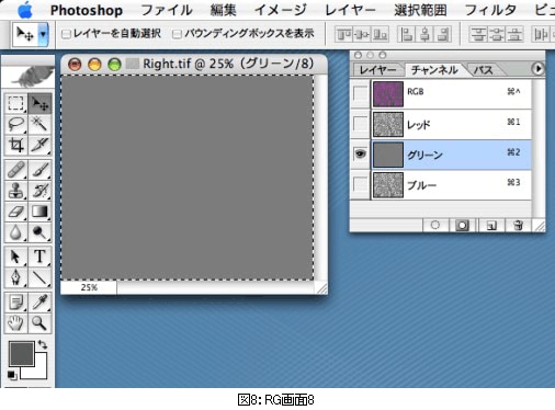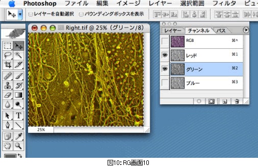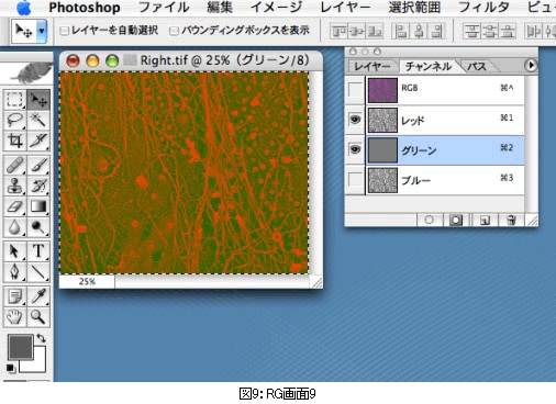 下図9のようにレッドのチャンネルの左横のボックスをクリックし、目玉マークを点灯させレッドのチャンネルを見えるようにする。ただし、チャンネルはグリーンが選択されたままになっている。