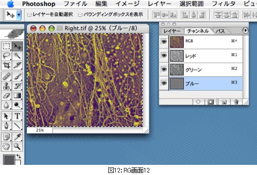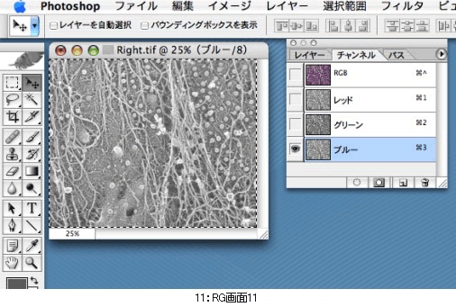 チャンネルのブルーのところをクリックし、ブルーのチャンネルのみを選択する。目玉マークはブルーのチャンネルの横にだけ点灯している(下図11)。「編集」のプルダウンメニューから「塗りつぶし」を選択し、OKを押す。