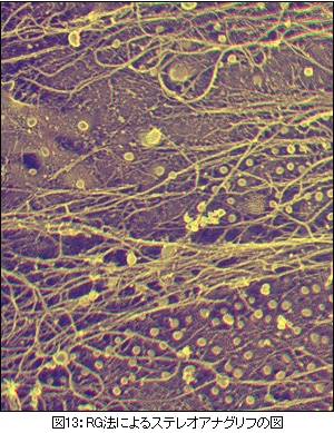 ここでは傾斜角の違いによる空間情報を、緑と赤の色情報に変換し、それらを重ね合わせた一枚の写真(ステレオアナグリフ)を作り、観察時に左右が赤と緑からなるステレオ眼鏡で観察し、空間情報を視覚として復元する方法を紹介する。