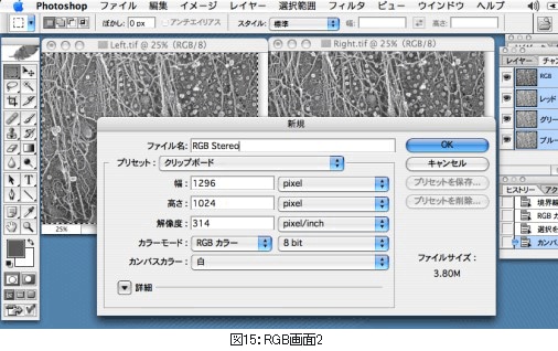 新規書類を作成する。「ファイル」をプルダウンし、「新規・・・」を選ぶ(コピーした範囲に合わせて新規のファイルの大きさなどが設定される)。名前を「名称未設定」ではなく「RGB Stereo」など適当な名称にする。つづいてOKを押す。