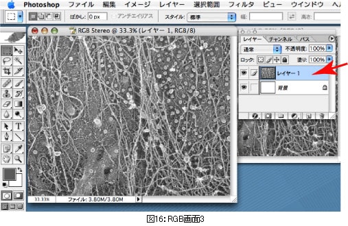 新規書類(名称RGB Stereo)にペーストする。「編集」をプルダウンし「ペースト」を選ぶ。この時レイヤーにはレイヤー1という名前で入る(下図16の矢印)。背景は無画像でホワイト。