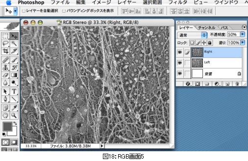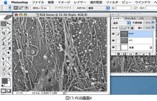 ここまでの操作は必須ではないが、操作の手違いなどでオリジナルを上書きにより消してしまうことを防ぐための手段である。また、この操作により二つの写真は「RGB Stereo」というキャンバス中のレイヤーとして取り込まれたことになり、以後の画像処理はレイヤーを選択するだけで進められる。したがって、オリジナルの画像は片づけて良い(下図17)。一番上のレイヤー「Right」を選択し、不透明度を50%に下げ、両方の画像が見えるようにする。RG法と同様に移動ツールを使用して、位置を合わせる(見たい領域が合うようにする)。