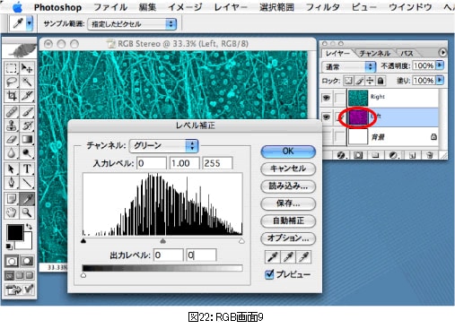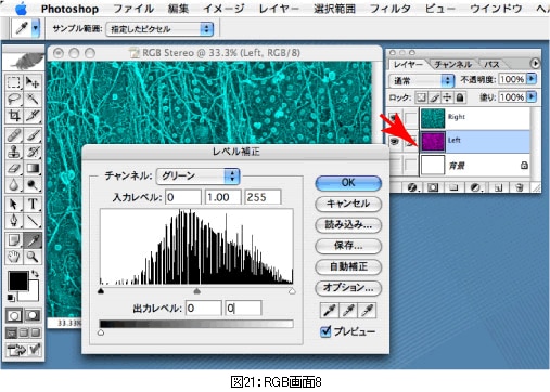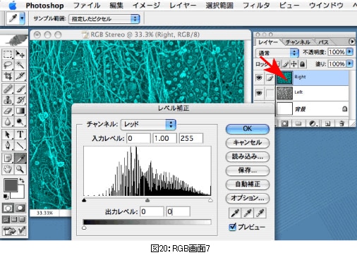 「イメージ」をプルダウンし「色調補正」から「レベル補正」を選択する。チャンネルからレッドを選択し、出力レベルを255から0に変更し、OKをクリックする(レイヤーが青緑になる)(下図20の矢印)。