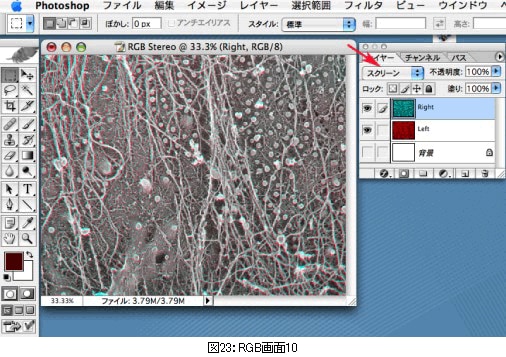 一番上のレイヤー(この場合Right) を選択して、レイヤーを通常からスクリーンに変更する。(下図23の矢印)