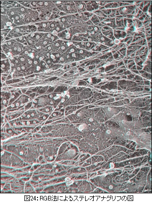 どちらの方法も二枚の写真のうち枚を赤優先に、もう一枚を緑優先にして、重ね合わせることにより作成されるのであるが、青(B)のチャンネルが開いているかどうかにより、バックグラウンドの色が黄色か自然色(電顕の場合は黒)かの違いが出る。しかし、作成法は青(B)のチャンネルを開けるか閉じるかだけではなく、かなり異なる。