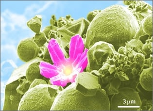 岩がゴロゴロした1×10-3 Paの真空砂漠に咲く一輪の花。この花はSEMのクライオシステムを利用し、液体窒素温度で急速凍結された霜の観察例です。まるで雪の結晶のような姿です。温度を上げるとこの花は儚く散ってしまいます。見事に咲いた一瞬の命を観察できました。