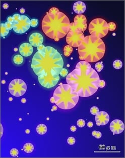 鏡体内に乱れ咲く、大輪の花火たち。その大きさは3~数十µmと千差万別。この花火の仕掛け人は酸化膜の還元により膜間に発生した水蒸気ガスです。ガスによって弾かれた膜の中心には、基板のSiが見え隠れしています。