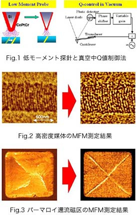 Fig.1に示す低モーメント探針と真空中Q値制御法を併用した高分解能MFM技術開発により、垂直磁気記録媒体などの高密度記録された磁気情報を鮮明に観測することが可能となりました。(1)