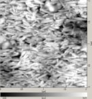 タイトル画像はAFM5000の新機能<形状像と物性像の重ね合わせ>を使った画像です。形状の特徴と磁気特性を1つの画像で見ることができます。この例では、磁気微粒子の1個1個が、どのように記録磁化を形成しているかがよくわかります。
