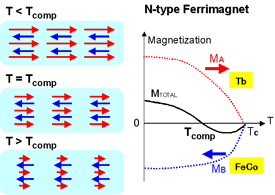 Fig.1にこのような面白い温度特性をもつフェリ磁性の機構について示します。フェリ磁性体は、それぞれ温度特性の異なる2つの副格子からなり、それら2つの副格子の磁気モーメントの和がトータルの磁気モーメントになります。N型のフェリ磁性では、ちょうど2つの副格子の磁気モーメントが打ち消しあう温度が存在し、その温度は補償温度(Tcomp)と呼ばれています。1)