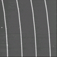 タイトル動画はMFM探針を利用してパーマロイ細線中の単一磁壁群をマニピュレートした実験結果を示しています。モノトーンの形状像にカラーの磁気像を重ね合わせた動画で表現しています。MFM探針はテレビの走査線と同様、画面の上から下に走査されますが、単一磁壁を見つけた時点で明るい信号が現れ、走査とともにそれぞれの単一磁壁が細線に沿って磁気的な作用でマニピュレートされ、画面下まで達しています。