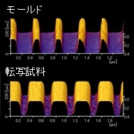 タイトル画像は、金型であるモールドとナノインプリント転写試料のAFM画像です。 ナノインプリントプロセスの1つである熱サイクルナノインプリント法では、モールド(SiO2、Si)を転写試料(PMMA/Si基板)に加熱しながらプレスしてパターンを形成します。fig1はモールド形状評価結果、fig2はプレス条件を変えたときのナノインプリント試料の比較評価結果です。 プレス条件によって転写形状に違いが見られ、プレス時の温度が150℃の時には凸部左上に突起があり凹部形状もモールド形状と一致していません。また、プレス温度が180℃では溝深さが違っており、プレス温度120℃が、よりモールド形状を正確に反映していることがわかります(1)。(サンプルご提供:兵庫県立大学 松井研究室)