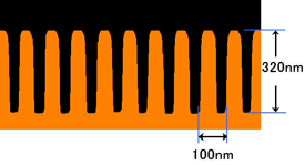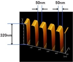fig.1はNTT-ATN製シリコンパターンサンプル(高さ320nm、ライン&スペース50nm)のハイアスペクト形状(7:1)測定例です。SISモードを組み合わせることにより側面からの吸着影響は著しく低減され、従来測定が困難であったナノスケールのハイアスペクト形状測定が容易に行えるようになりました。