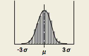 計測値を度数分布で表したものが、図3-2です。多くの計測データを収集すると、データの分布は、図3-2の様にガウス(正規)分布に近づきます。分布の特徴は、平均値:μ(ミュー)と標準偏差:σ(シグマ)で表されます。データは、μ±3σの中に99.73%の確率で入るという意味があります。