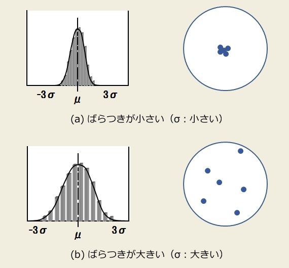 σが小さいと図3-3(a)のように、ばらつきが小さくなり、大きいと(b)のようにばらつきが大きくなります。ばらつきが小さい場合を精度(precision)が高い、または、再現性(repeatability)が高いといいます。
