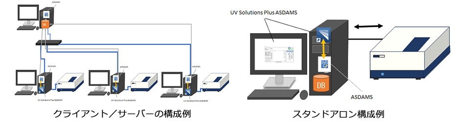 ASDAMS(Analytical Solution Data Management System)プログラムは、DI(データインテグリティ)対応のデータ管理プラットフォームです。ASDAMSプログラムには、サーバーとクライアント機能があります。ASDAMSプログラムをUV Solutions Plus ASDAMSプログラムと接続して使用することで、サーバー上でデータベースを管理できます。