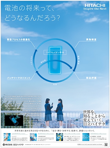 リチウムイオンバッテリーをテーマに、日立ハイテクが「見る・測る・分析する」の技術で材料開発から製造、再利用まで包括的にサポートしている企業である事を表現しています。社会課題起点で価値を創造する企業としてメッセージを発信することで、日立ハイテクの存在感を高め、企業価値向上を図ってまいります。