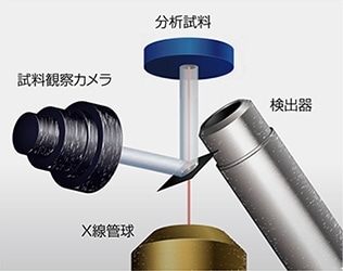 従来の装置において、これまで測定部位に対して斜め下側から試料にX線を照射した場合、試料に埋没した異物や凹凸のある試料分析では、測定部位を試料台と同じ高さになるように加工し測定する必要がありました。EA1400では、透明のコリメータ*5ブロックと反射板を用いることで照射X線と試料観察カメラが捉える光線を同軸とする構造にし、正確に測定部位へX線を照射でき、加工しにくい試料をそのままの状態で分析することが可能となりました。