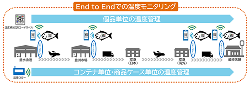 貼り付けた対象物そのものの温度を検知する『MiWAKERUⓇ』の温度検知QRコードラベルをカンパチに貼り付け、カンパチ自体の温度検知を行います。また、商品ケース内外に温度ロガー*1を設置することで、カンパチ周辺の環境温度も測定します。個品単位からコンテナ単位に至る広範囲で厳密な温度モニタリングを実施し、輸送品質の見える化を実現いたします。
