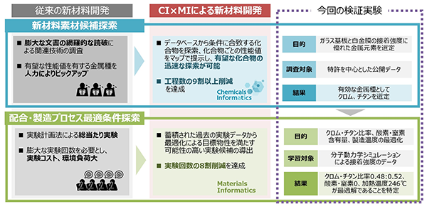 株式会社日立ハイテク(以下、日立ハイテク)は、電子デバイスなどに用いられる金属薄膜材料の開発において「Chemicals Informatics(以下、CI)」と「マテリアルズ・インフォマティクス(以下、MI)」を用いた開発効率化に関する検証実験(以下、本実験)を行いました。これにより、新材料の開発においても全体の開発工数を8割以上削減し、業務効率化できることを実証しました。