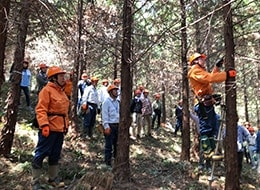 現地では、班ごとに分かれて指導員に道具の使い方や木の切り方の指導を受け、慣れないのこぎりを使いながら、枝を切り落としたり、班のメンバーと協力して木を切り倒したりと、約1時間「枝打ち」と「間伐」を行いました。