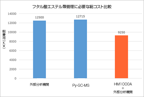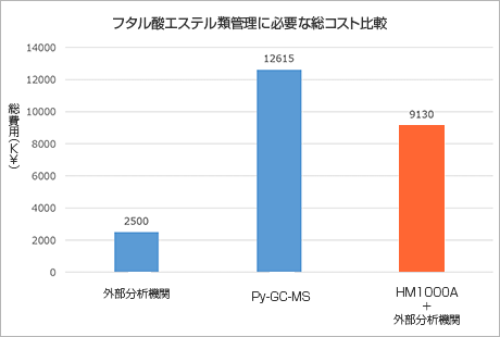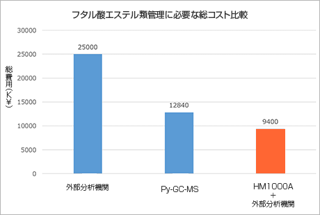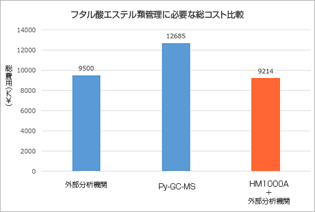 受託分析機関を利用した場合、HM1000Aとよく比較される測定手法である熱分解ガスクロマトグラフ質量分析計(Py-GC-MS)を導入した場合とのコストの比較例をご紹介します。