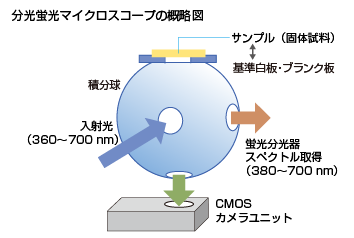 分光蛍光マイクロスコープは、F-7100形蛍光光度計の試料室ユニットに装着可能なオプションです。積分球に入射光を照射することで、均一な照明条件で試料を観測することができます。既存の蛍光側分光器で蛍光スペクトルを取得、積分球下部のCMOSカメラユニットで 画像を同時に取得します。