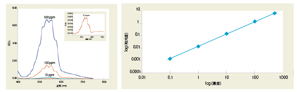 含水過マンガン酸カリウムの各濃度の吸収スペクトル(左図)は、優れた測光精度と測光域を有していることを示しています。555 nmの吸収に着目した場合、希釈なしで0.1~500ppmの分析が可能です。吸光度と濃度の検量関係のプロット(右図)は、広いダイナミックレンジと優れた直線性(R2=0.999)を示しています。