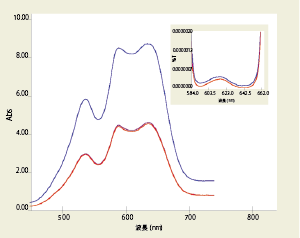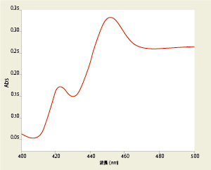 混濁した生物サンプルの吸光度変化の測定は、サンプルのバックグラウンド吸光度が4Absを超える場合があるため、一般的には測定が困難になります。上図は、高濁度シトクロムP450を測定し、4.5Absを超えるバックグランドの吸収を差し引いた差分のスペクトルを示します。このサンプルの実際の吸光度は5Absに近いですが、0.05Abs未満の変化が精度良く検出されています。
