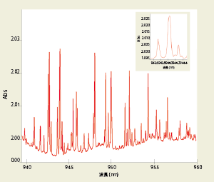 近赤外領域における水蒸気の高分解能測定において、一般的な分光光度計では分離が困難な940 nm付近のピークを明確に分離します。Cary 6000iは、InGaAs検出器での測定に最適化された600本/ mmの近赤外用回折格子を備えており、卓越した近赤外性能を発揮します。