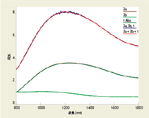 下の図は2枚の青いフィルタをそれぞれ測定した結果と、重ねて測定した結果を示しています。 それぞれのフィルタを測定して得られたスペクトルを足し合わせた結果と、重ねて測定したスペクトルの差は8x10-8%T未満であり、紫外可視領域における優れた直線性と測光域を実現していることを示しています。