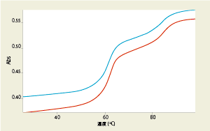 Cary 4000の正確で再現性の高い温度制御により、DNAの巻き戻しの様な複数の遷移に起因する、瞬間的な吸光度の変化を検出することができます。図では三重鎖DNA融解の第2の遷移状態を示しています。