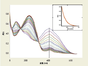 マウスを1回クリックするだけで、一連の繰り返しスキャンからカイネティクス曲線を得られます。図は、410 nmにおけるカイネティクス曲線を示しています。