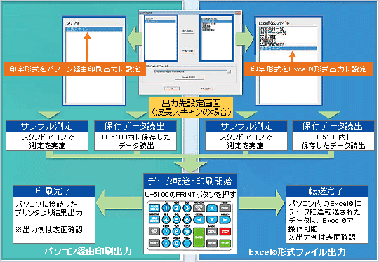 U-5100*1にパソコンを接続することにより、UV Solutions*2を使用することなく、データ保存が可能になり、パソコンに接続したプリンタから印刷も可能です。