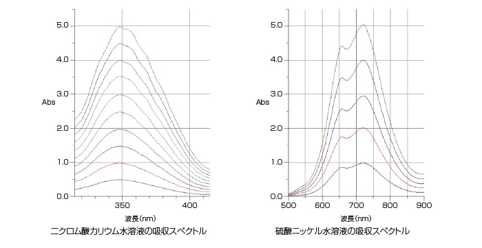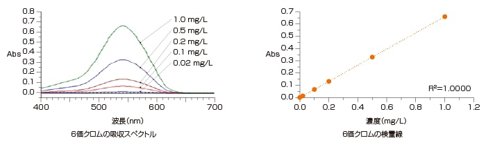 RoHS指令で規制対象となっている6価クロムについて、ジフェニルカルバジド吸光光度法により分析した例を示します。6価クロムを株式会社 共立理化学研究所製の「水質測定用試薬セット 6価クロム」を用いて測定しました。吸収スペクトルの測定結果より、波長540 nmに吸収ピークを有していることが確認できました。吸収ピークの540 nmにおける検量線は、R2=1.0000と良好な直線性が得られました。