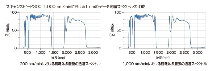 波長駆動にギヤドライブ方式を採用したことにより、約0.3〜5,000 nm/minと従来機と比較して紫外可視域の高速スキャンを実現しました*2。1 nmのデータ間隔で測定する場合1,000 nm/minで190〜3,300 nmの範囲の測定が約4分で可能となります。