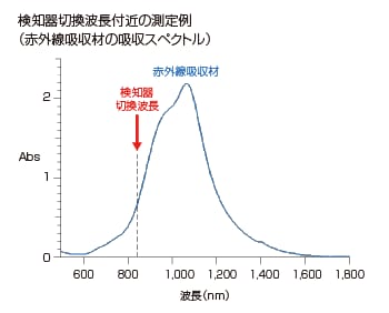 波長 800~1000 nm付近に最大の吸収ピークを持つスペクトルが得られました。検出器の切り替え波長850 nmにおいて、段差の少ないスペクトルとなっています。