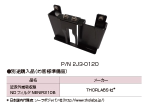近赤外域の測光レンジ域を拡大したい場合に使用します。近赤外域の測光レンジ域を拡大した測定を行うためには、レファレンス側減光フィルタホルダ(2J3-0120)の他に下表に示すTHORLABS社製近赤外域吸収型 NDフィルタNENIR210Bが必要です。