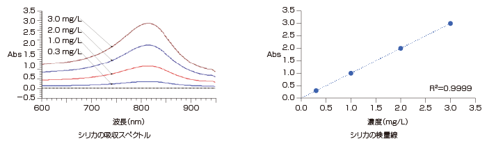 シリカはJIS K0101 工場用水試験方法にてモリブデン黄吸光光度法による測定方法が規定されています。シリカを株式会社 共立理化学研究所製の「水質測定用試薬セット シリカ」を用いて測定しました。吸収スペクトルの測定結果より、波長815 nmに吸収ピークを有していることが確認できました。吸収ピークの815 nmにおける検量線は、R2=0.9999と良好な直線性が得られました。