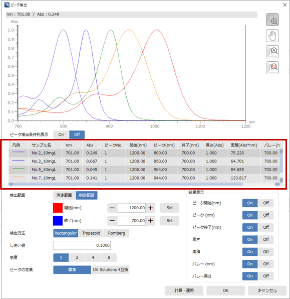 専用ソフトUV Solutions Plusにて、検出に使用する波長範囲や検出方法を設定し、複数サンプルを同時にピーク検出する事が可能です。また、検出結果は一覧表で表示する事が可能です。